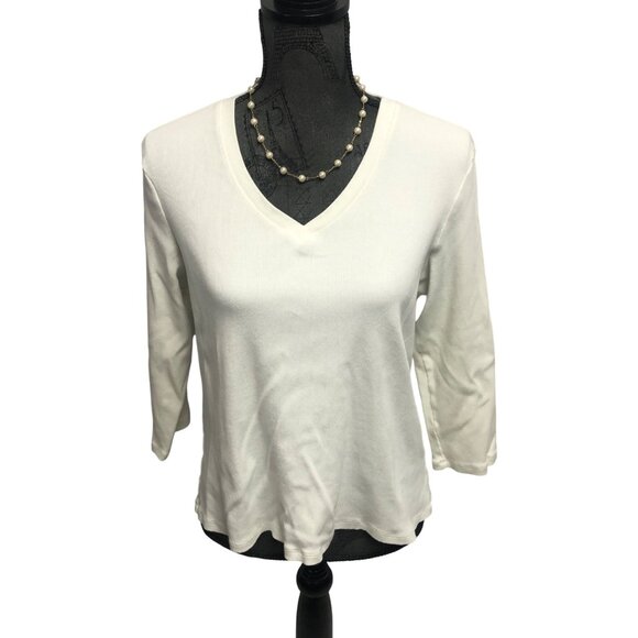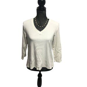 Lands End Ribbed Top Womens Size Large 14-16 White V Neck Shirt Casual Layering