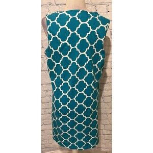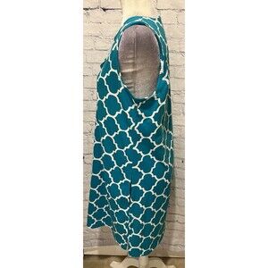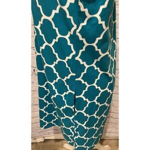 The Lands' End Shift Dress in Teal Geometric Pattern is a versatile and stylish addition to any woman's wardrobe. Made of comfortable cotton, this sleeveless dress features a classic V-neckline and convenient pockets. The knee-length shift dress is perfect for traveling or casual occasions, making it a practical and fashionable choice for the warmer seasons of spring and summer. The eye-catching geometric pattern in a beautiful blue color adds a pop of style to this timeless and classic dress from Lands' End. 20 inches pit to pit and 36 inches long. Smoke free home.