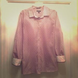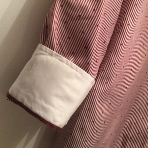 Beautiful Lands End Button down in 100% luxe No Iron Supima Cotton. Lovely Shiraz stripe with Swiss Dot pattern. Gorgeous grosgrain detailing at sleeve and button panel (shown in photos). Features long sleeves, 7 button front, mid hip length cut, and bust shaping darts. Classic, sophisticated, timeless, and season less, this will be a go to piece in your wardrobe for years to come! Perfect for the holidays; to wear or to gift! 🎁🎉