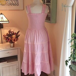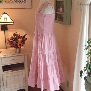 Warm pink sundress with a fully shirred bodice. Shirred straps. Full skirt. Four ruffles joined with eyelet lace. Pockets. Size L (14-16) measures 32-42 at bodice to waist, full skirt. 47 long from shoulder to hem. So pretty and ready for warm weather.