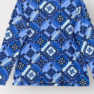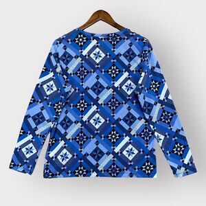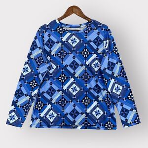 Lands' End Shirt Women PM Blue Geometric "Navy Prosperity Quilt" Print Supima Cotton Crewneck Relaxed Fit Long Sleeve Stretch