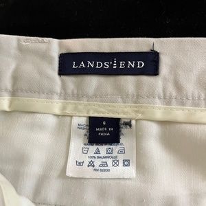 Lands' End plain front shorts, size 8. Light tan in color, the waist measures 32 inches, and the inseam measures 7 inches. Non-smoking household.