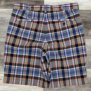 Lands End Blue Yellow Mens 32 Traditional Fit Madras Plaid Flat Front Chino Shorts, 100% cotton, blue yellow green red, 4 pockets design,