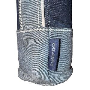 The image shows a Lands' End single-bottle wine tote, made from blue denim. It features a handle and is designed to carry a single bottle of wine (not included, duh!) They are suitable for gifting and for transporting wine. Some versions can hold two bottles and have additional pockets.