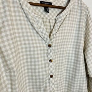 Lands' End Size 14 Flannel Top - Gray Gingham 100% Cotton Collarless. Features all over gray gingham plaid print, v-neckline, long sleeves, regular length, pullover closure, and half button front.