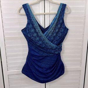 Lands End Size 14L Swimsuit Blue One Piece Sarong Geometric