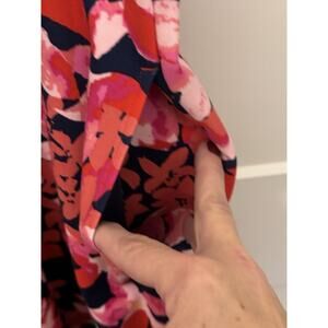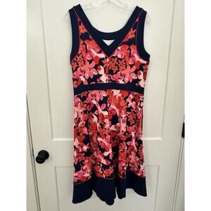The Lands' End Sleeveless Pink Flowers Ponte' Knit Dress in size 14 is a stylish and versatile option for summer occasions. This knee-length dress features a floral pattern in shades of pink and navy, perfect for a preppy or cruise-inspired look. Made from a blend of cotton, viscose, and elastane, the dress offers a comfortable fit with a full skirt design. Ideal for career casual events, this dress is easy to wear and can be dressed up or down for a variety of summer settings.