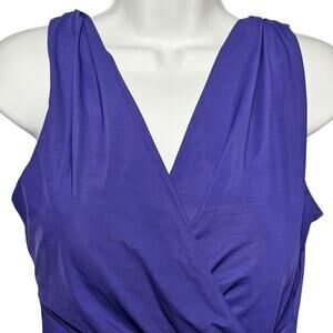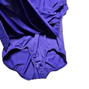 This is a NEW WITHOUT TAGS one-piece skirted swimsuit in purple from Lands' End is a Women's Size 14. The swimsuit is a gorgeous, rich-looking purple (it may look blue, but it's definitely purple) with a wrapped bodice and a little skirt on the front. Both the front and back of the swimsuit feature V-shaped necklines. The front of the swimsuit has extra fabric over the base swimsuit that wraps to the side, providing a slimming effect. The swimsuit has never been worn and, though the hygienic liner is still in place, the tags have been removed.