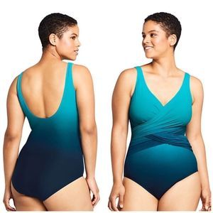 New Land’s End Plus Slenderize one piece wrap swimsuit in navy teal green ombré, Soft cup bra swimsuit size 8 DD