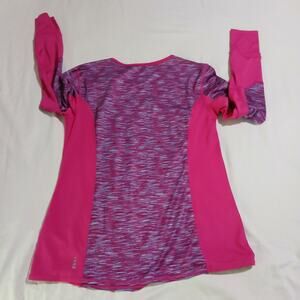 Lands' End Sport Size small top; slight swing fit in pink and purple with blocking to create structure when worn; hot pink sides and sleeves with purple/pink/white heathered texture in front and back along middle of shirt; round neck fit with hip-length hem; great material/fit for running or other outdoor activities!