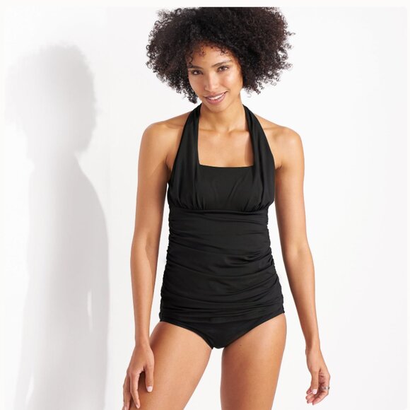 The adjustable halter & the square neck offers the more modest coverage you crave. Graceful bodice shirring flatters, while the UPF 50 and chlorine-resistant fabric protect you from harsh sun rays and keep your suit from fading.