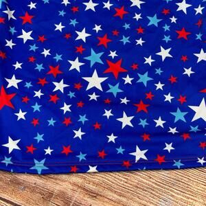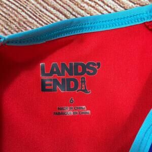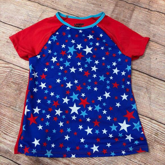 A vibrant Lands' End t-shirt featuring a colorful star pattern with red raglan sleeves. Perfect for casual wear and summer outings.