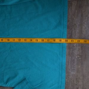Shirt in teal with blue, pale blue, silver, and gold hearts and stars