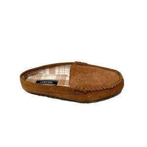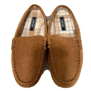 Lands' End Suede Leather Moccasin Slippers Plaid liner Tan Women’s 7