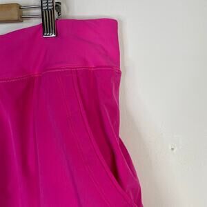 Shorts are a lightweight, stretchy blend of 90% polyester 10% spandex in Prism Pink, a bright happy shade of pink.