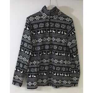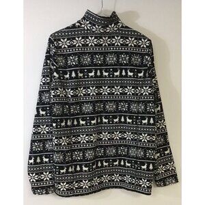 Lands' End Sweater Medium Black White Fleece Pullover Reindeer Snowflake Size MD