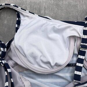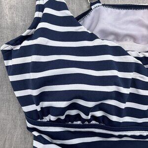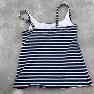 Lands' End Swim Top for Women in size 6. This blue and white striped tankini bra features wide straps and underwire support. Made from durable nylon, it offers comfort and style.