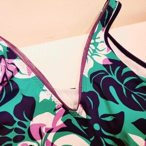 Beautiful colorful pattern swimsuit top (only) tankini style. This is preowned in great condition. This top is 24W with DDD underwire bra built in for great support of the girls. The top has a very small netting detail around the neckline for a little added coverage. These straps are not adjustable, but I always found them to be the perfect size.