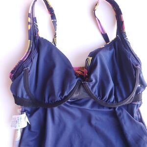 Lands End Tankini Swim Top Size 8 Deep Sea Jungle Print Blue Underwire NO PADS
