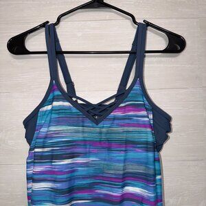 Lands’ End Tankini Swim Top Size Small 4/6 Blue Purple Striped Criss Cross Back