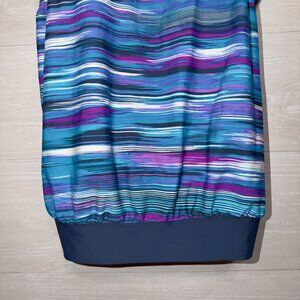 Flattering and stylish Lands’ End Tankini Swim Top in size Small (4/6), featuring a vibrant blue, purple, and teal striped print. Designed with a built-in shelf bra for support and adjustable crisscross straps for a secure, customizable fit. The blouson-style silhouette offers a comfortable, flattering shape with great coverage. Perfect for pool days, beach vacations, or resort wear.