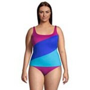 Incredibly supportive swim top with underwire and molded cups. Flattering square neckline. Adjustable straps. Figure flattering diagonal color blocking in magenta, royal blue, and teal with orange trim. Offers UPF 50 sun protection. I always paired with a pair of navy blue board shorts. From a non smoking home.