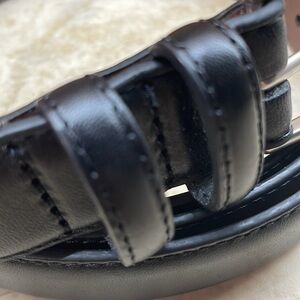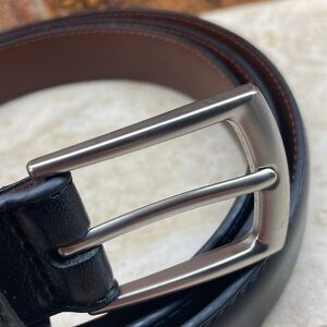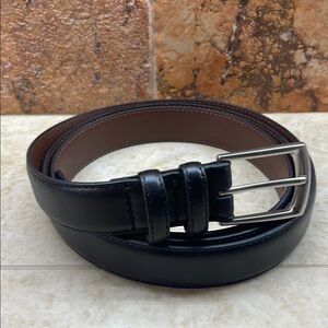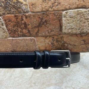 Classic and versatile black leather belt by Land’s End, from The Outfitters collection. Features a sleek silver-tone buckle and a smooth brown underside. Size 56 – ideal for big & tall sizing. Perfect for dress or casual wear. Gently used with minimal signs of wear.