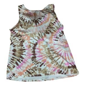 Vibrant pink, peach, and brown tie-dye swim tank with high neckline and full internal shelf bra. Features soft molded cups and a smooth supportive inner lining for secure coverage. The fabric is stretchy and smooth with a glossy finish, ideal for swimming or other water activities.