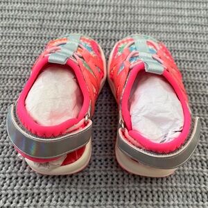 Girl's (toddler) light-weight, colorful water sandals from Land's End. Water-friendly sandals with mesh upper, rubber soles and a protective toe cap to keep your toddler's feet safe. Wide rip and grip velcro closure with pull tab for easy on and off. Brand new with tags! The original purchase price was $47.95