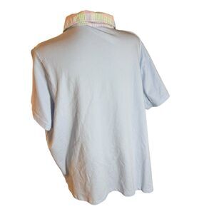 The product is a Lands' End women's top in size 2XL, featuring a classic fit and a blue plaid pattern with a multi-colored collared shirt. This short sleeve polo shirt has a collared neckline, button closure, and cap sleeves, making it suitable for all seasons. With a basic style and classic theme, this top is perfect for everyday wear and can be styled for various occasions.
