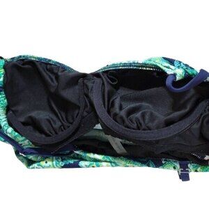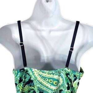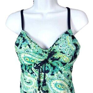 Lands' End green blue paisley ruched tie in middle adjustable strap underwire removable padding tankini swim top. Excellent pre-owned condition with no stains or tears.