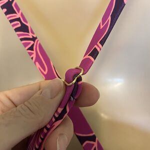 The tropical print is a colorful pink and orange against the dark navy blue background.