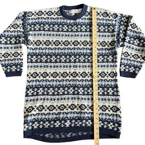 100% cotton. Medium weight sweater. Pretty fair isle pattern in shades of blues and whites.
