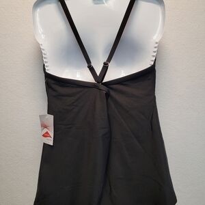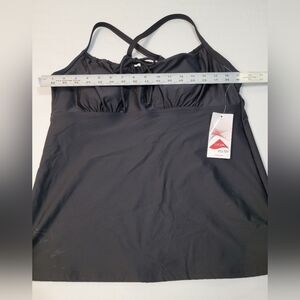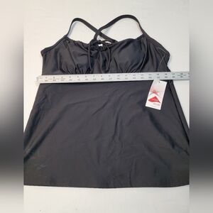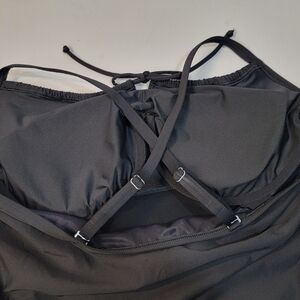 New With Tags Land's End women's size 16 black built-in underwire bra, drawstring keyhole neckline, adjustable crisscross straps with silver colored hardware, gathered bust line, flattering swimwear top. ( bin A)