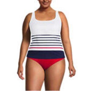 Incredibly supportive swim top with underwire and molded cups. Flattering square neckline. Adjustable straps. Soft white with navy and red stripes. Offers UPF 50 sun protection. I always paired with a pair of navy blue board shorts. From a non smoking home.