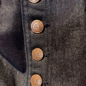 High rise with button fly and patch pockets. Stretchy, new with tags. Dark indigo color. 42"L and 12" wide.