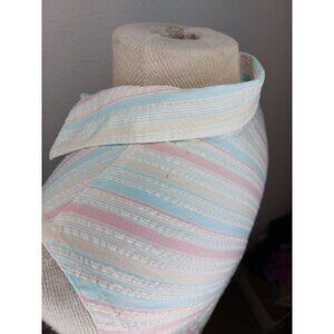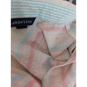 Lands End Women 10 Petite Sleeveless Collar Button Down Blouse Pastel, Seersucker, 100% Cotton, Collar, Bust Darts, 36" Bust 22" Length , Small white Pearl Buttons, White Blue and pink diagnal stripe