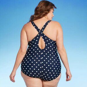 Lands' End Women's 1X 16W/18W Blue Polka Dot Print High Neck 1 Piece Swimsuit