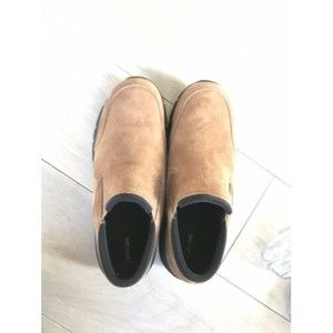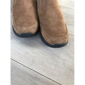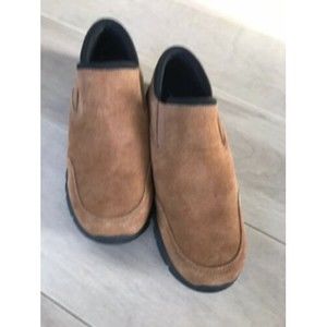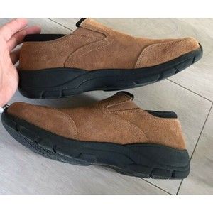 Lands End Women's All Weather Suede Leather Slip On Moc Shoes clogs slip ons 10. Rts $73Lightweight yet ruggedTwin gores with padded stretch collar for a personalized fitKnit liningDual-density sole has treads for tractionAccent stitchingImportedComfortable, sturdy alternative to sneakersYour favorite All Weather Moc with some of the best details yet. Since we first offered them, more than a million people have made these their favorite go-anywhere, anytime shoes. And you can bet not all those feet fit into these shoes exactly the same way. So weve gone several comfortable steps further in making these feel like they were made just for you. The twin gores on the vamp complement a smooth neoprene padded collar that curves around your ankles for a snug but gentle fit. The contours on the outside of the entire shoe are leaner, streamlined, and not so bulky. The outsole is treaded for traction without being lug-heavy."
