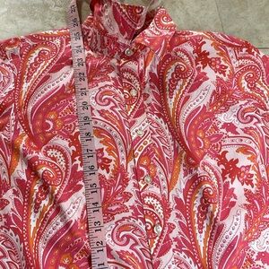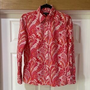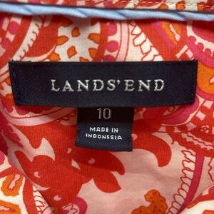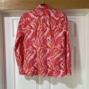 Land’s End women’s button-down shirt in size 10. Gorgeous red, pink, and orange paisley print on a white background. Long sleeves with button cuffs, collared neckline, and full front button closure. 97% cotton, 3% lastol, lightweight and comfortable. Great for work, casual wear, or layering. In good pre-owned condition. See pictures please