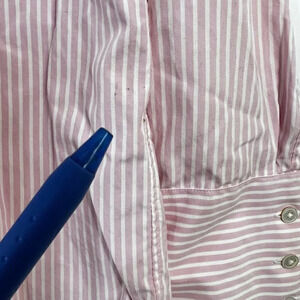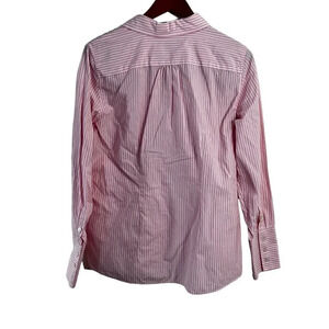Elevate your wardrobe with this beautiful pink and white Lands' End button-up top. Perfect for casual wear, work, or business, this top features a collared neckline, long sleeves, and a button closure. The casual sleeve style and unlined feature make it suitable for all seasons. Made from 100% cotton, this top is machine washable for easy care. The top accentuates the chest with its front ruffles and has a regular fit with size 12 measurements. The striped pattern adds a touch of elegance to the basic style. This top is perfect for any occasion and is sure to become a staple in your wardrobe.