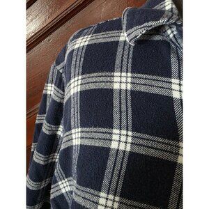 This cozy flannel shirt by Lands' End features a classic plaid pattern in navy and white. Made from 100% cotton, it offers softness and warmth. Designed with long sleeves and a button-up front, this shirt is ideal for layering during cooler seasons, providing both comfort and style.