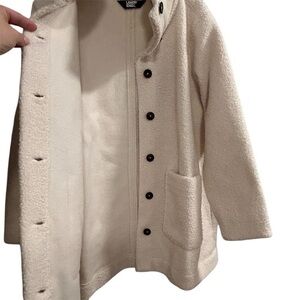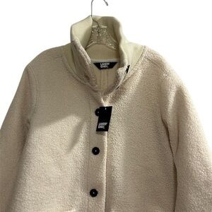 Keywords: Lands End, women's coat, ivory overcoat, faux-shearling, winter coat, polyester, button closure, front pockets, casual wear, mid-length coat, L size, long sleeve, solid pattern, new condition, China.