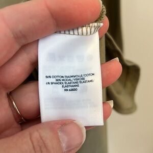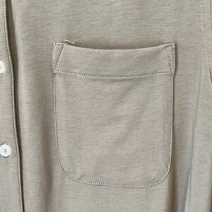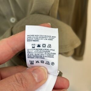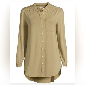 This is a beautiful light olive green color. The shirt buttons all the way up the front and on the sleeves. There is a pocket on the chest and a rounded bottom hem that is tunic length. The back is longer than the front and the shirt is so soft and comfortable. This shirt is in excellent condition. Lots of stretch. Size medium.
