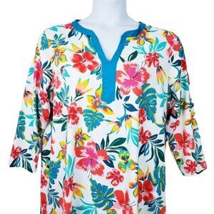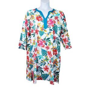 Lands End long sleeve tropical print beach swim cover up dress in blue, green, yellow, red, pink, and white. Long sleeve dress. Colorful multicolor tropical print. Stretchy material. No stains or holes. Swim beach cruise resort vacation cover up dress.