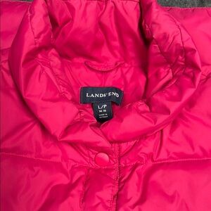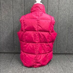 Bright pink puffer vest. Sleeveless with a high collar. Button closure. Quilted design.