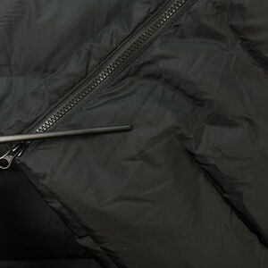 This jacket is in excellent condition - there are two very minor flaws noted in the last two pictures with the pointer. One is a very minor lighter mark (not a tear) and the other is at the bottom of the jacket where a thread that creates the "puffer look" unraveled a few inches.