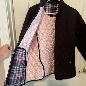 Lands' End Women's Quilted Puffer Jacket - Dark Brown pink & plaid lining