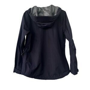 This Lands' End Squall Waterproof Rain Jacket is a women's size medium 10-12. The color is a very dark navy blue. This is windproof and waterproof. The hood, cuffs, and hem are all adjustable. It has two inseam zip pockets, and one zip pocket on the chest. There are also two interior slip pockets and one pocket for a pen or possibly to hook your glasses on. It is in very good pre-owned condition without any stains or holes. There are two small spots on the lining that look like it may be separating, or it could possibly be where there is excess material overlapping at the seam. These spots have been circled in one of the photos. This will be coming from a smoke free, pet friendly home.