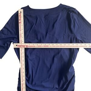 Lands’ End short sleeve rash guard swim shirt in navy blue. Features white embroidered detailing along the neckline, a V-cut collar, and adjustable side ties for a flattering ruched fit. Made of 91% nylon and 9% spandex for stretch and comfort.